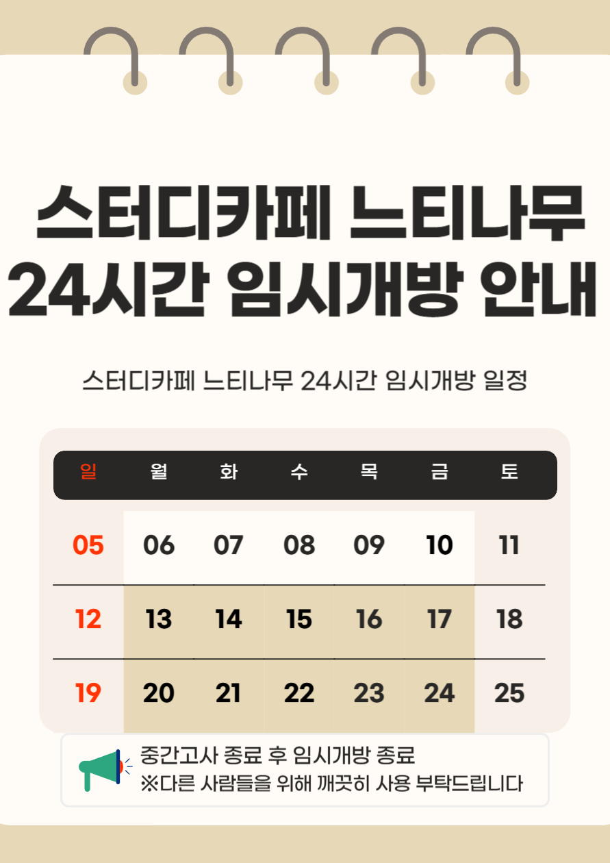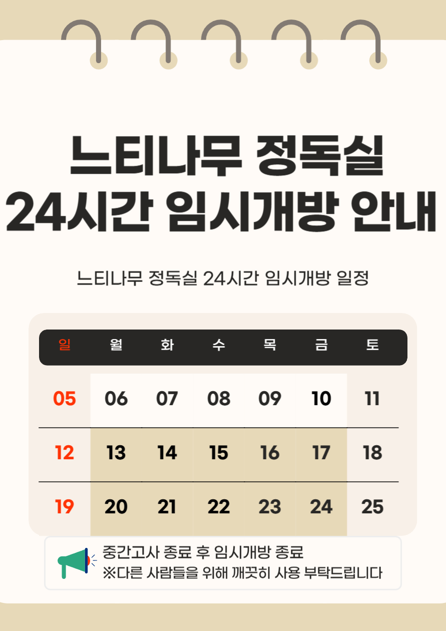 [공지] 2025-1학기 중간고사기간 [스터디카페 느티나무, 느티나무 정독실 임시개방] 안내